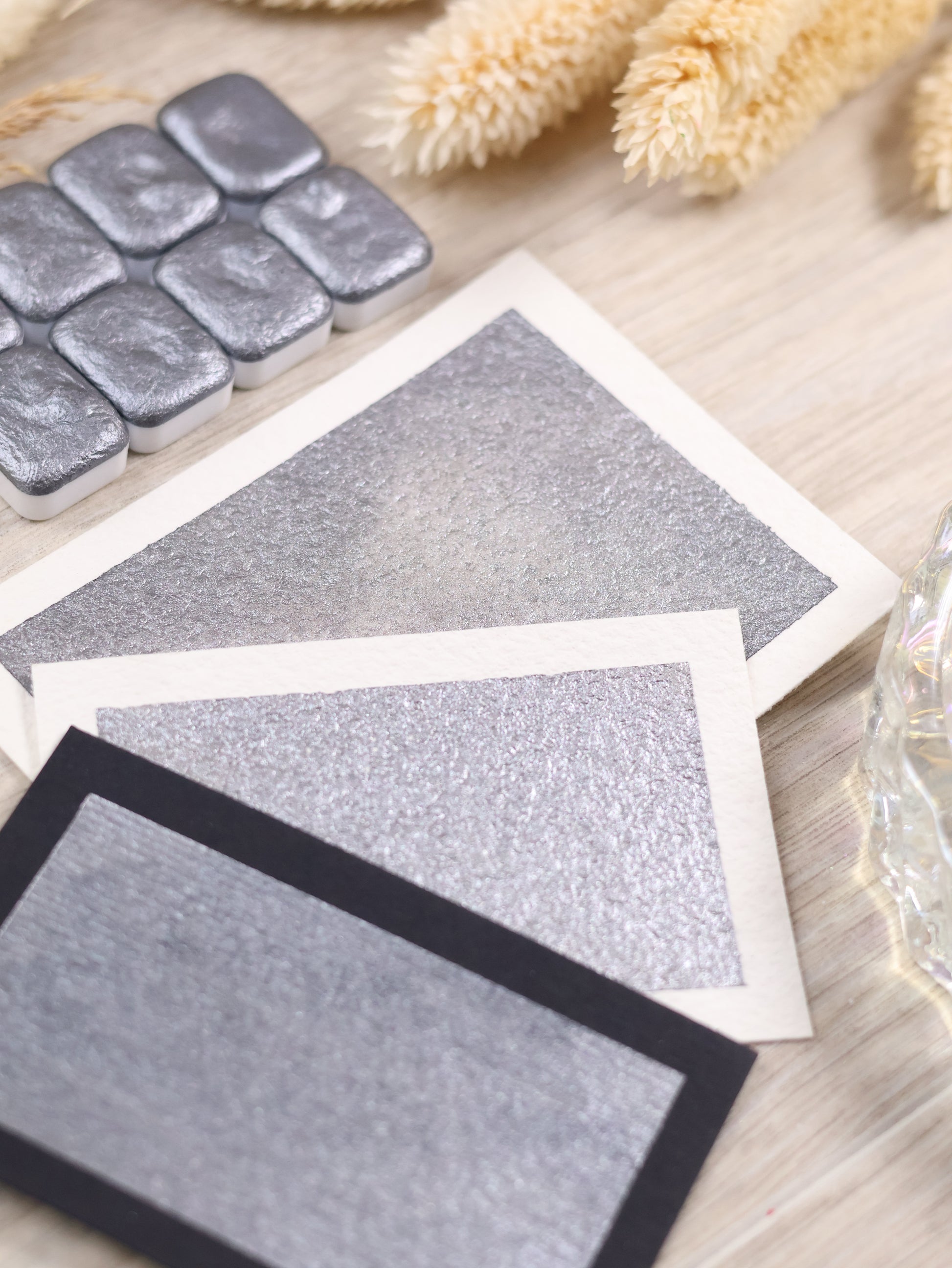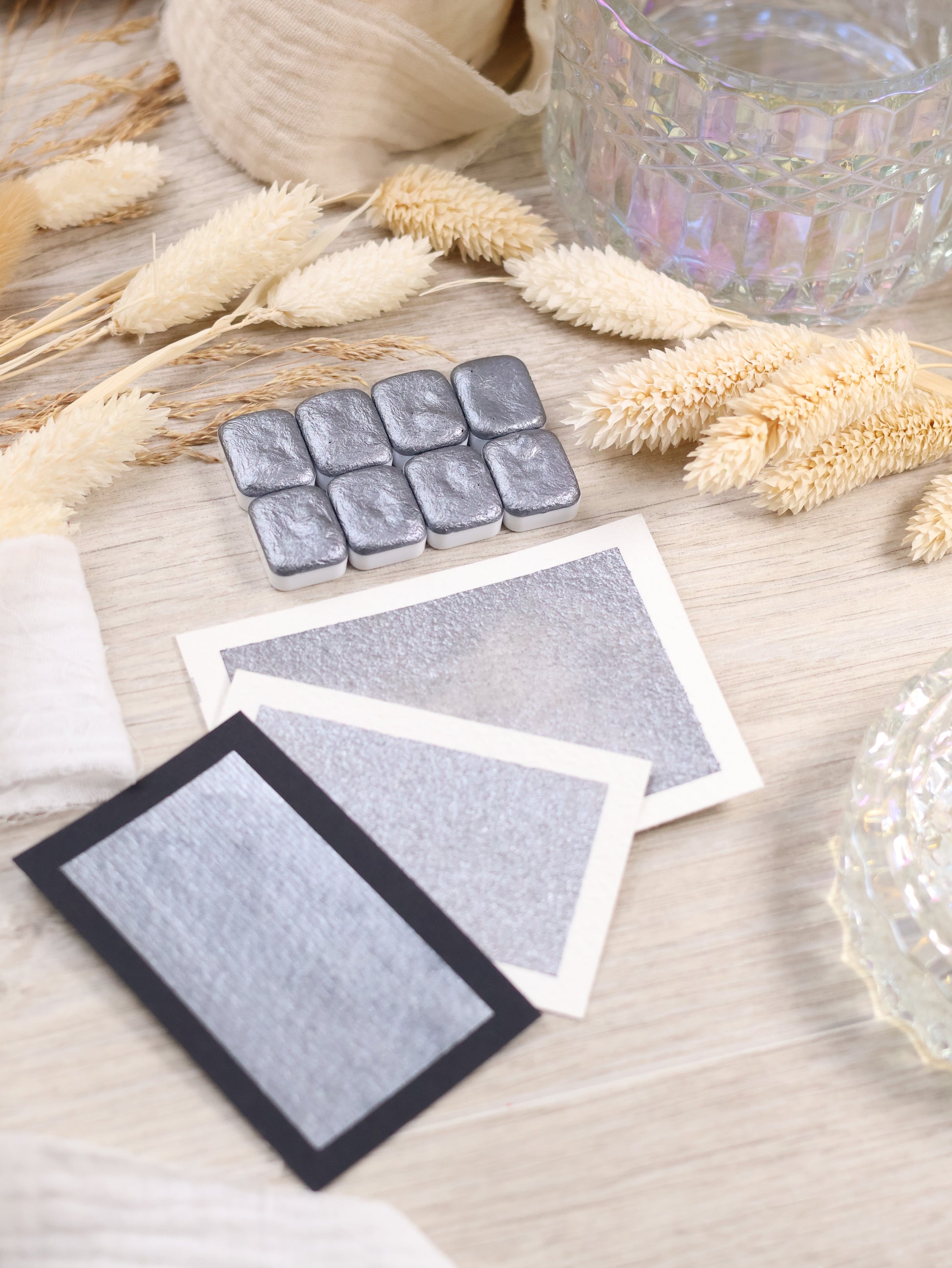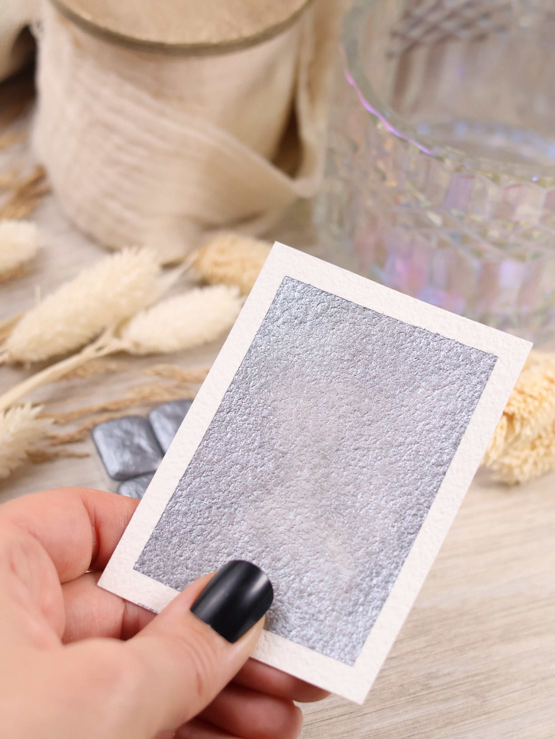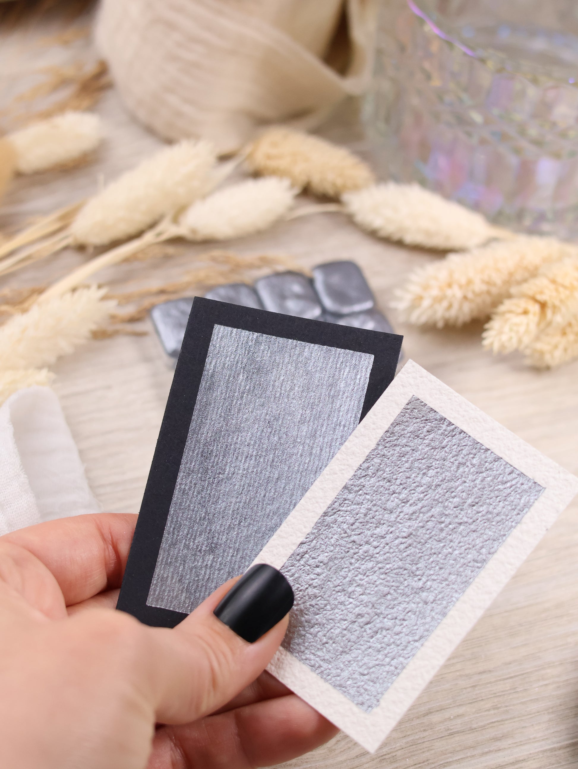 Aquarelles métallisées, scintillantes ou pailletées faites à la main, fabriquées à partir de pigments de mica de qualité cosmétique. * Mettez de l’eau sur les godets et attendez 3 ~ 5 minutes pour un meilleur rendu des couleurs. Taille des godets : Quart de godet : 1 ml - 1.5x1.9x0.5 cm Mini godet : 0.5 ml - 1.5x1.1x0.5 cm. NB*: Pendant la fabrication, il peut y avoir des imperfections mineures telles que des bulles ou des fissures, celles-ci font partie du processus et n’entravent pas la qualité ou l’utilisation du produit. J’ai essayé de représenter les produits aussi précisément que possible, mais les couleurs sur les écrans et les mobiles peuvent varier. Notez également que tous les matériaux d’arts / décoratifs montrés sur les photos sont utilisés uniquement à des fins décoratives et ne sont pas inclus. Utilisation des produits : Nos aquarelles ne sont pas des produits classiques et doivent être utilisées différemment. Elles aiment être utilisées avec délicatesse pour en obtenir le meilleur. Visualiser le tutoriel sur notre Instagram « Utilisation » et prenez le temps de faire quelques essais avant de vous lancer dans vos créations pour vous familiariser avec votre nouvelle aquarelle. Les aquarelles caméléons : Pour un résultat optimal, je recommande de les utiliser sur du papier noir ou une couleur foncée et une surface suffisamment longue pour observer l’effet caméléon. Sur papier blanc le rendu est différent. Les chromes : Ils ne nécessitent qu'une couche sur papier noir mais plutôt deux sur papier blanc pour une intensité maximale. Note de la fée paillettes ✨ :Il arrive que certaines couleurs Velvets se décollent légèrement du godet en séchant — une petite coquetterie naturelle de l’aquarelle artisanale ! Rien de grave : un petit point de colle suffit à la remettre en place. Cela n’altère en rien la magie de vos créations. 🌸