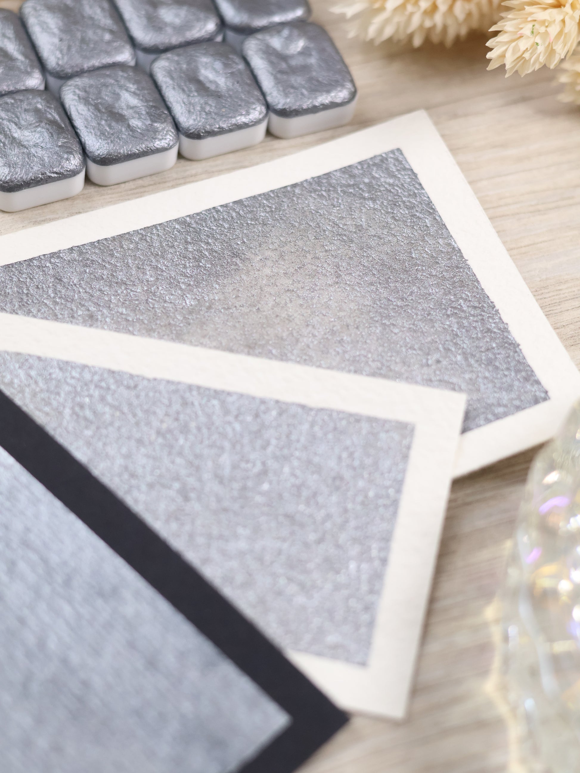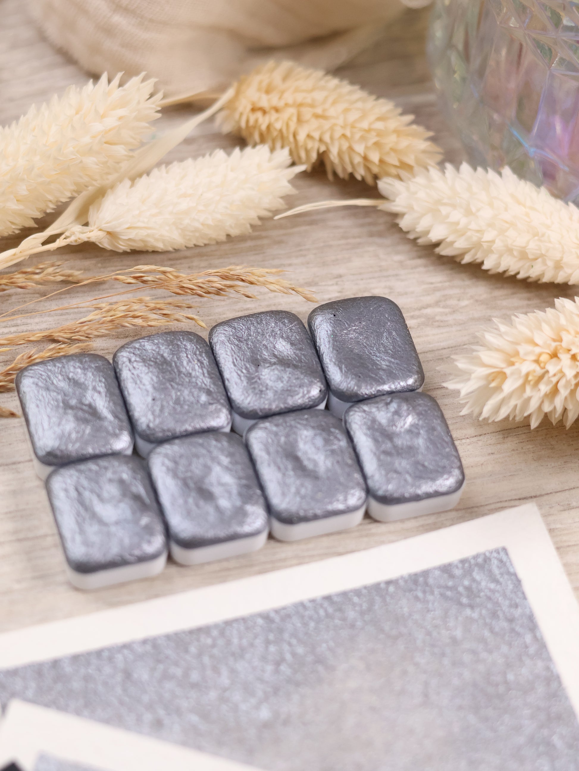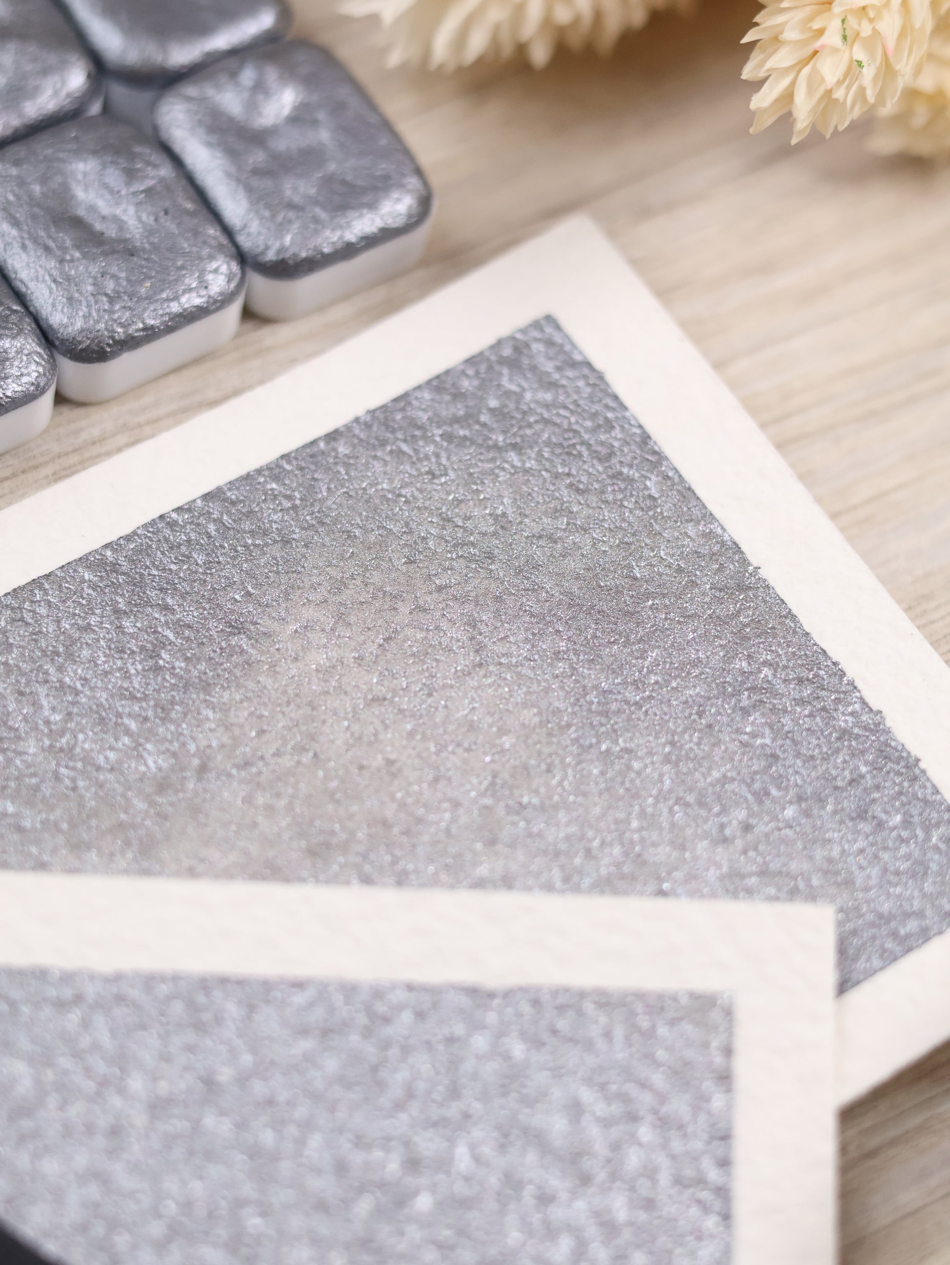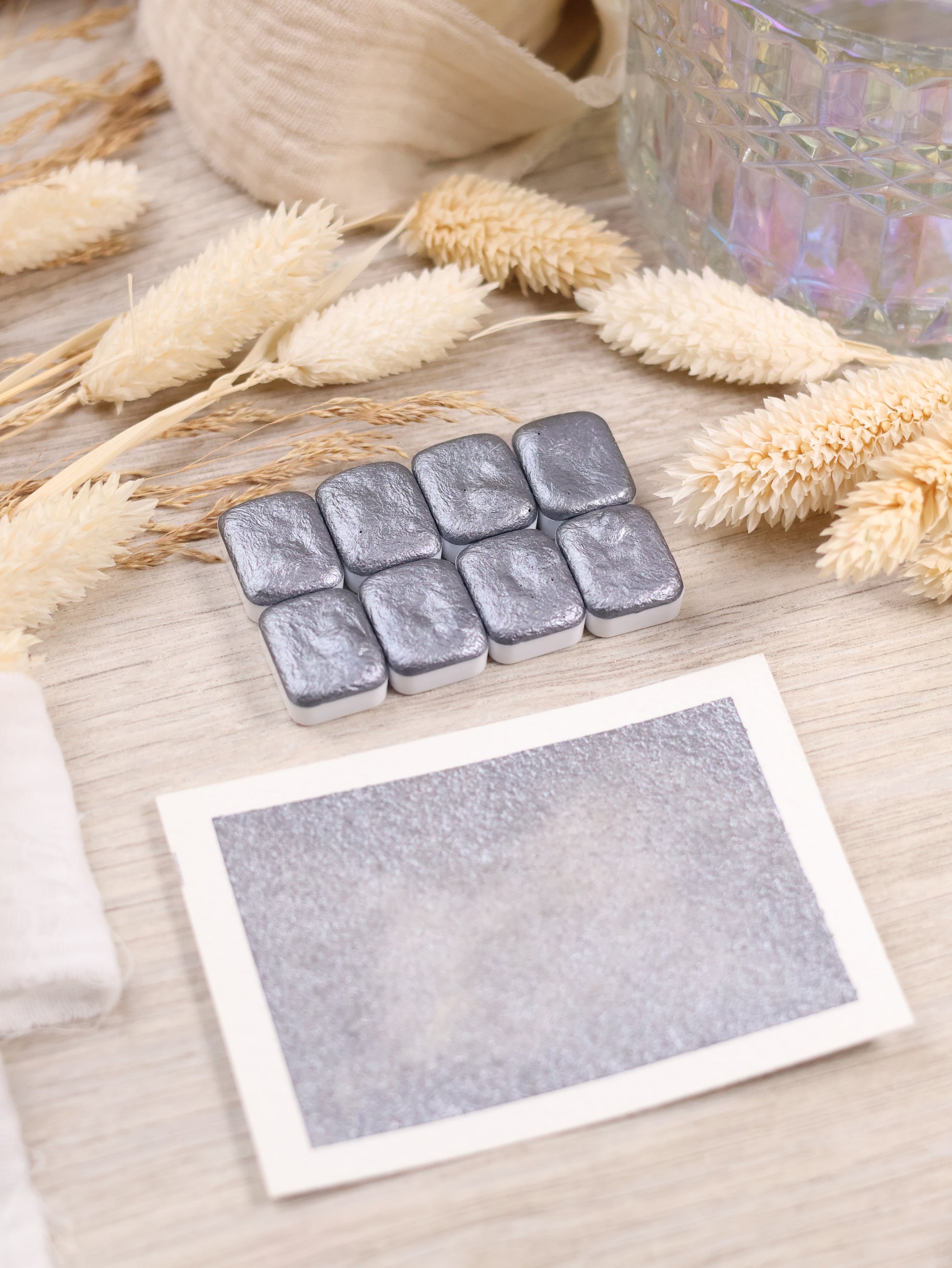 Aquarelles métallisées, scintillantes ou pailletées faites à la main, fabriquées à partir de pigments de mica de qualité cosmétique. * Mettez de l’eau sur les godets et attendez 3 ~ 5 minutes pour un meilleur rendu des couleurs. Taille des godets : Quart de godet : 1 ml - 1.5x1.9x0.5 cm Mini godet : 0.5 ml - 1.5x1.1x0.5 cm. NB*: Pendant la fabrication, il peut y avoir des imperfections mineures telles que des bulles ou des fissures, celles-ci font partie du processus et n’entravent pas la qualité ou l’utilisation du produit. J’ai essayé de représenter les produits aussi précisément que possible, mais les couleurs sur les écrans et les mobiles peuvent varier. Notez également que tous les matériaux d’arts / décoratifs montrés sur les photos sont utilisés uniquement à des fins décoratives et ne sont pas inclus. Utilisation des produits : Nos aquarelles ne sont pas des produits classiques et doivent être utilisées différemment. Elles aiment être utilisées avec délicatesse pour en obtenir le meilleur. Visualiser le tutoriel sur notre Instagram « Utilisation » et prenez le temps de faire quelques essais avant de vous lancer dans vos créations pour vous familiariser avec votre nouvelle aquarelle. Les aquarelles caméléons : Pour un résultat optimal, je recommande de les utiliser sur du papier noir ou une couleur foncée et une surface suffisamment longue pour observer l’effet caméléon. Sur papier blanc le rendu est différent. Les chromes : Ils ne nécessitent qu'une couche sur papier noir mais plutôt deux sur papier blanc pour une intensité maximale. Note de la fée paillettes ✨ :Il arrive que certaines couleurs Velvets se décollent légèrement du godet en séchant — une petite coquetterie naturelle de l’aquarelle artisanale ! Rien de grave : un petit point de colle suffit à la remettre en place. Cela n’altère en rien la magie de vos créations. 🌸