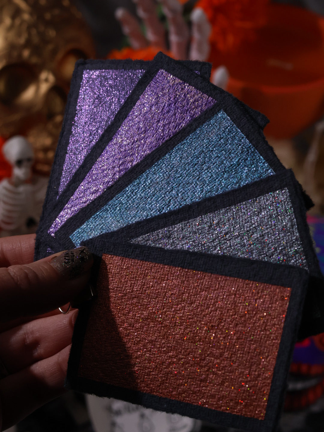 Corbeau : Un noir profond, constellé de millions de micro-paillettes violettes et holographiques, comme des ailes sombres sous la lune.