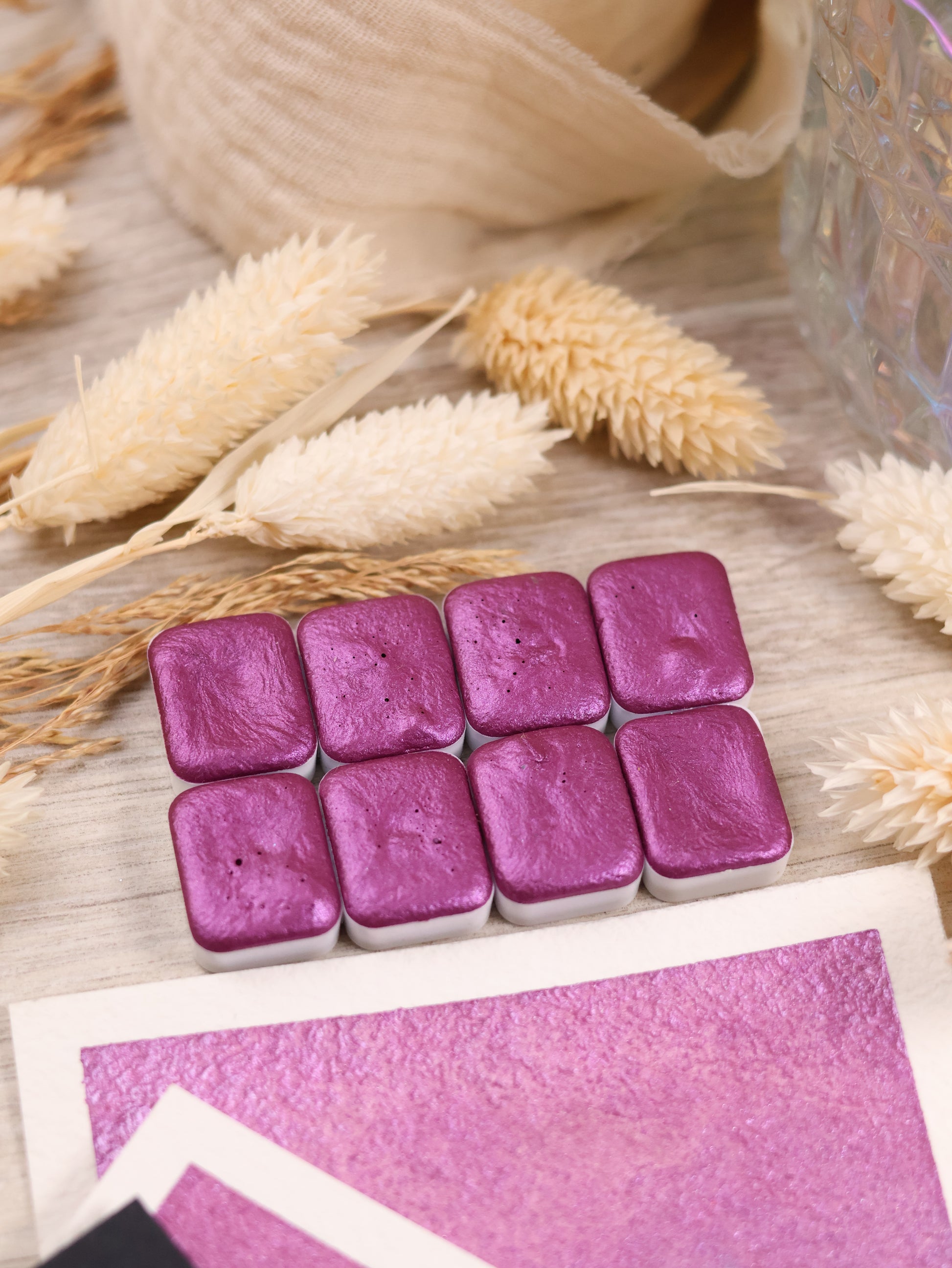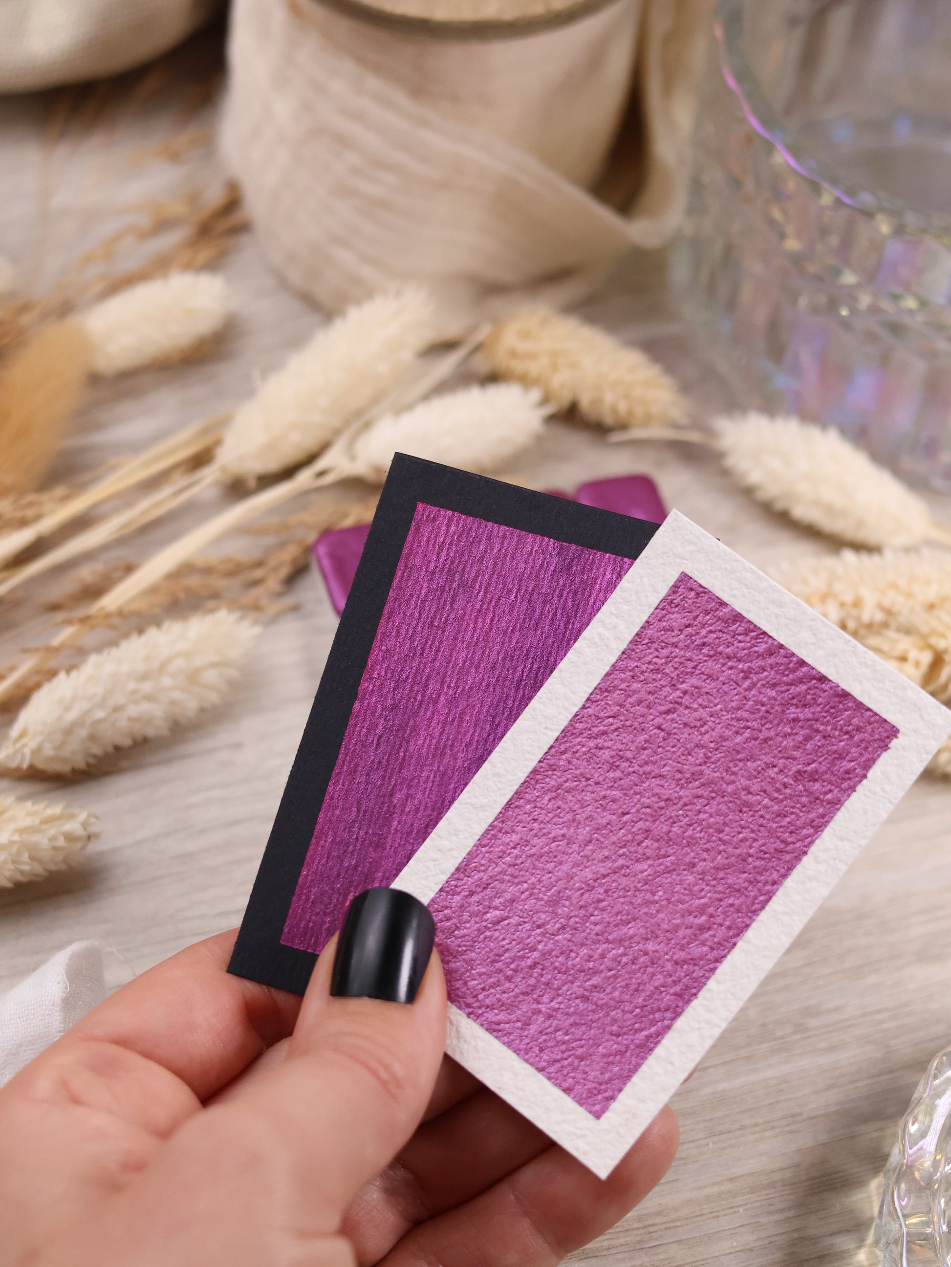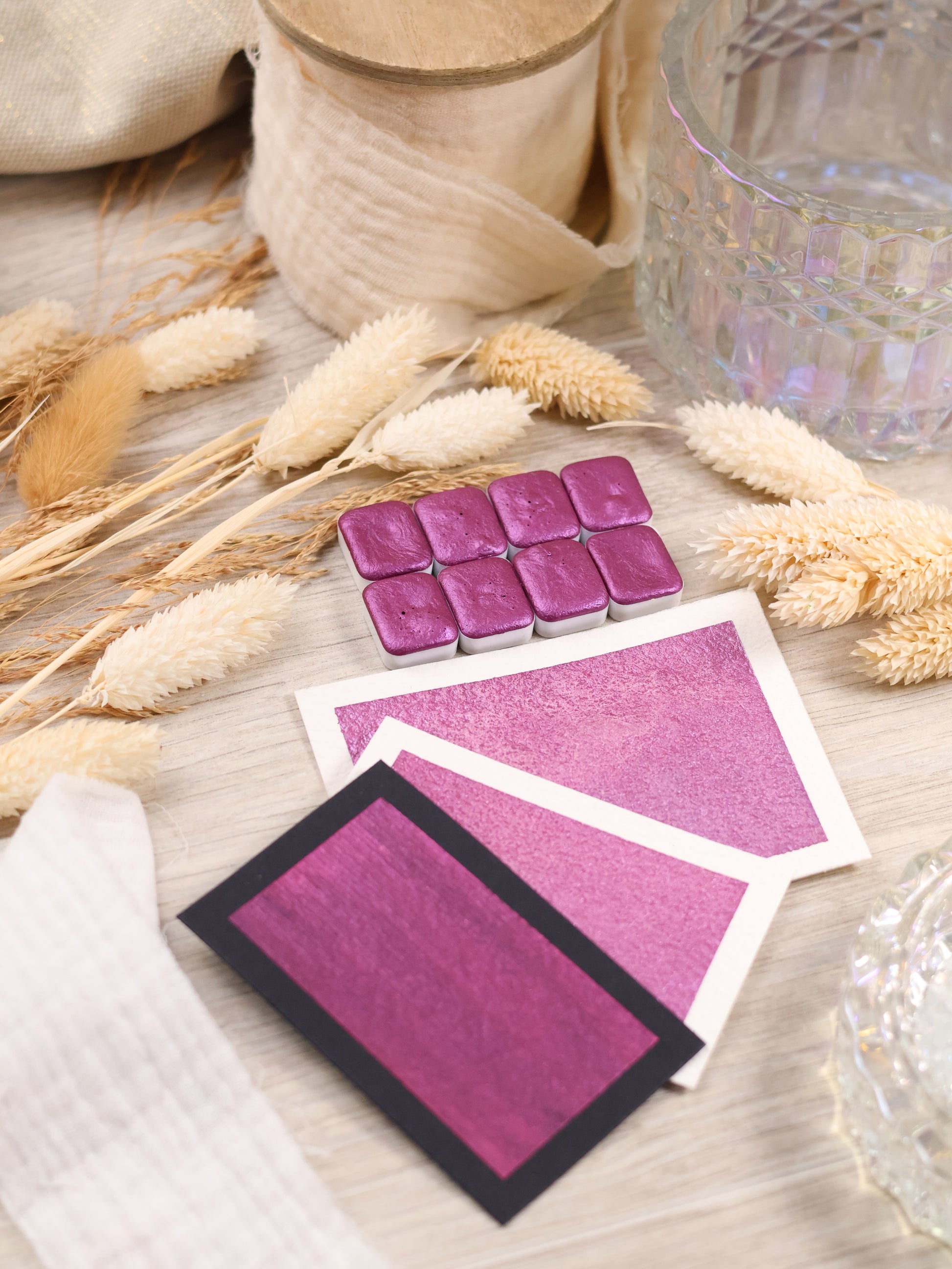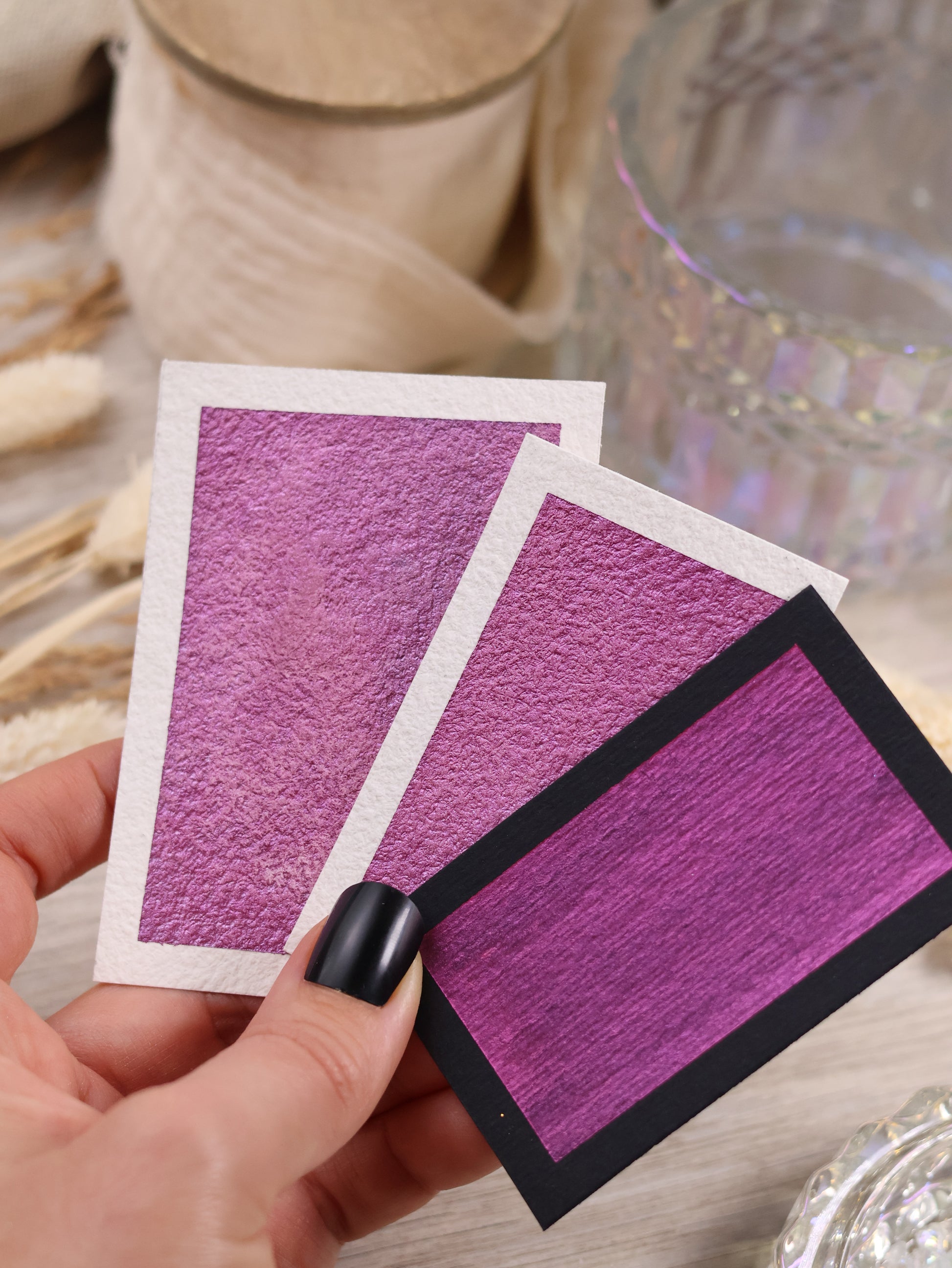 Aquarelles métallisées, scintillantes ou pailletées faites à la main, fabriquées à partir de pigments de mica de qualité cosmétique. * Mettez de l’eau sur les godets et attendez 3 ~ 5 minutes pour un meilleur rendu des couleurs. Taille des godets : Quart de godet : 1 ml - 1.5x1.9x0.5 cm Mini godet : 0.5 ml - 1.5x1.1x0.5 cm. NB*: Pendant la fabrication, il peut y avoir des imperfections mineures telles que des bulles ou des fissures, celles-ci font partie du processus et n’entravent pas la qualité ou l’utilisation du produit. J’ai essayé de représenter les produits aussi précisément que possible, mais les couleurs sur les écrans et les mobiles peuvent varier. Notez également que tous les matériaux d’arts / décoratifs montrés sur les photos sont utilisés uniquement à des fins décoratives et ne sont pas inclus. Utilisation des produits : Nos aquarelles ne sont pas des produits classiques et doivent être utilisées différemment. Elles aiment être utilisées avec délicatesse pour en obtenir le meilleur. Visualiser le tutoriel sur notre Instagram « Utilisation » et prenez le temps de faire quelques essais avant de vous lancer dans vos créations pour vous familiariser avec votre nouvelle aquarelle. Les aquarelles caméléons : Pour un résultat optimal, je recommande de les utiliser sur du papier noir ou une couleur foncée et une surface suffisamment longue pour observer l’effet caméléon. Sur papier blanc le rendu est différent. Les chromes : Ils ne nécessitent qu'une couche sur papier noir mais plutôt deux sur papier blanc pour une intensité maximale. Note de la fée paillettes ✨ :Il arrive que certaines couleurs Velvets se décollent légèrement du godet en séchant — une petite coquetterie naturelle de l’aquarelle artisanale ! Rien de grave : un petit point de colle suffit à la remettre en place. Cela n’altère en rien la magie de vos créations. 🌸