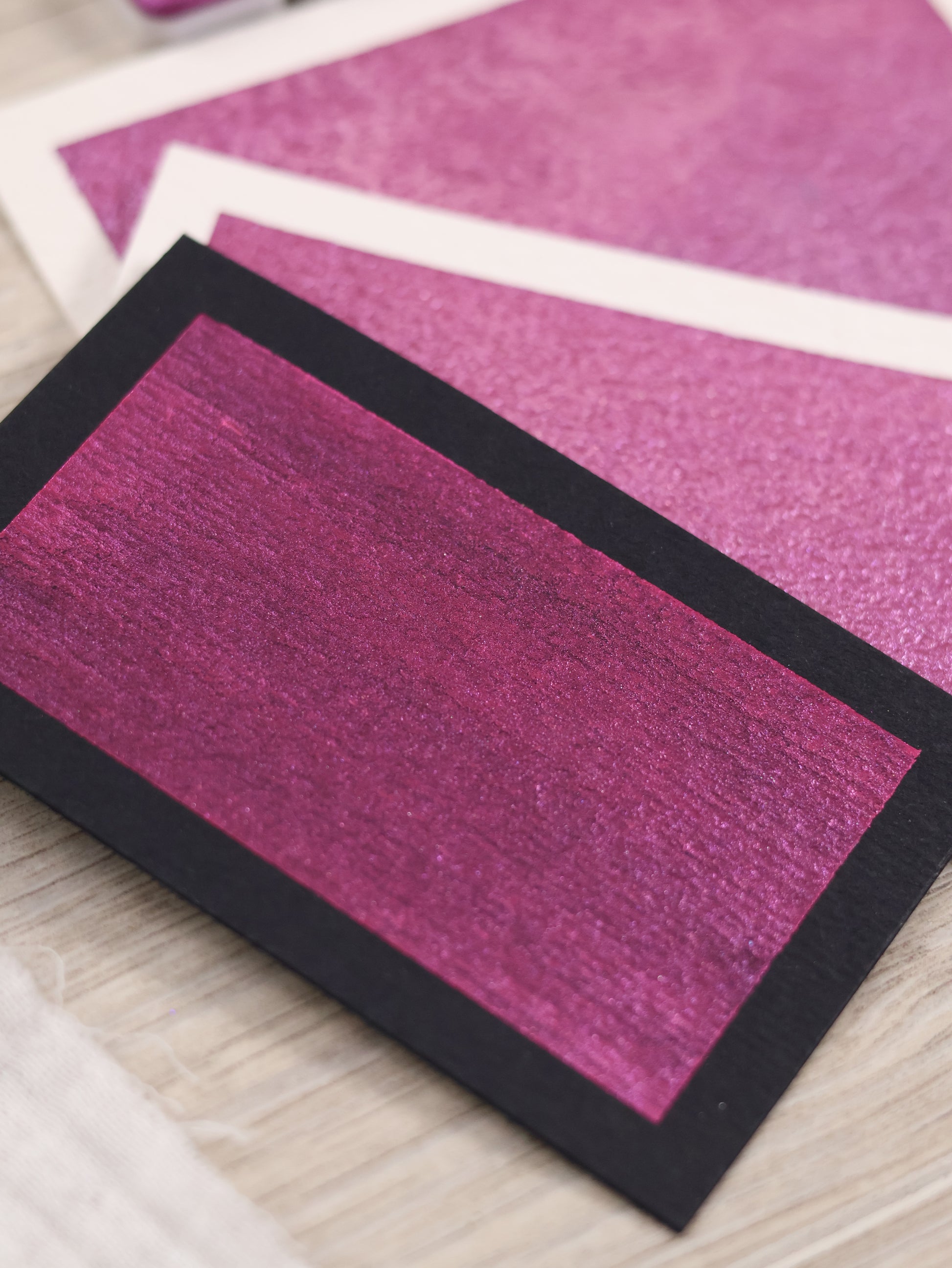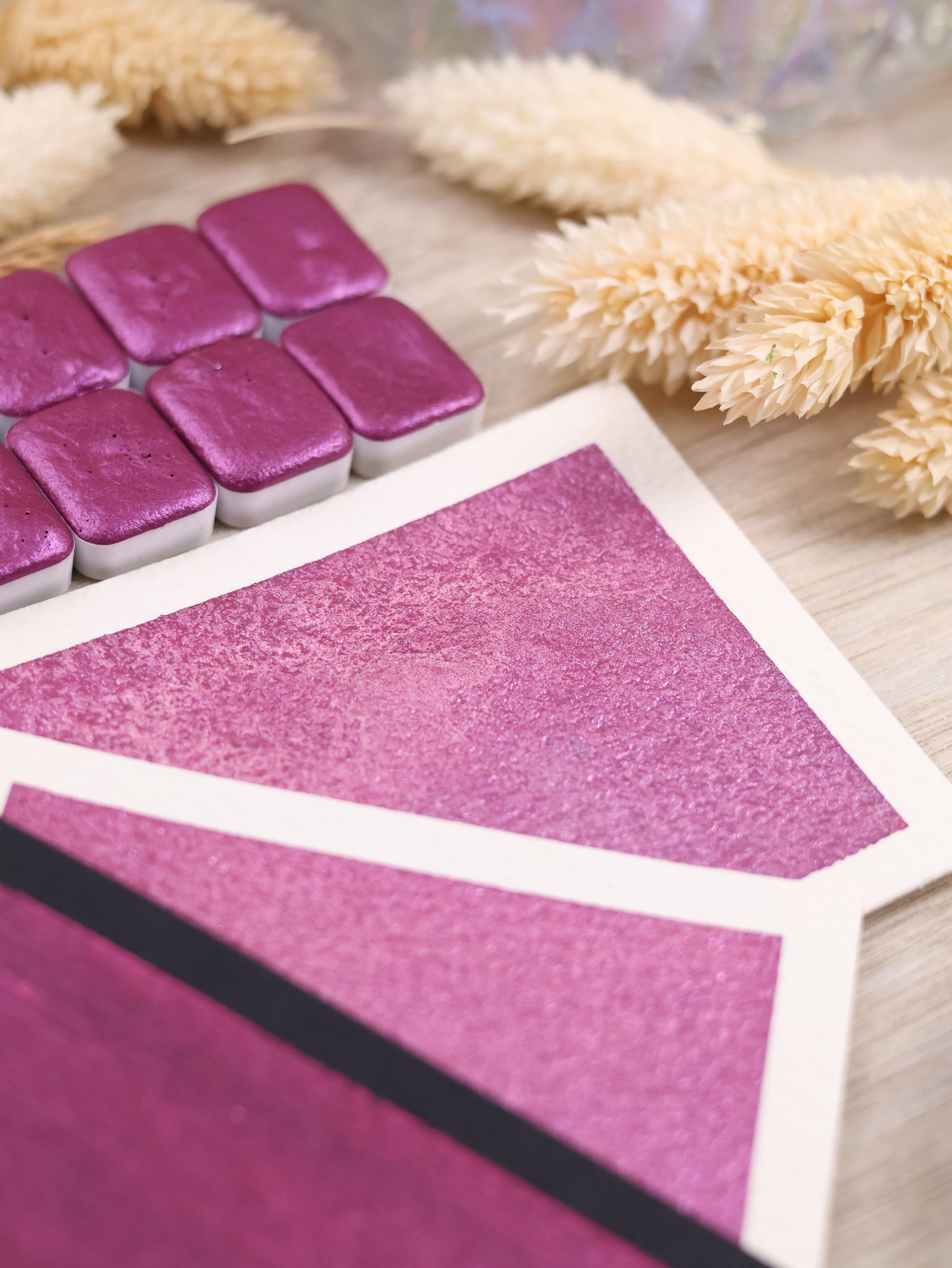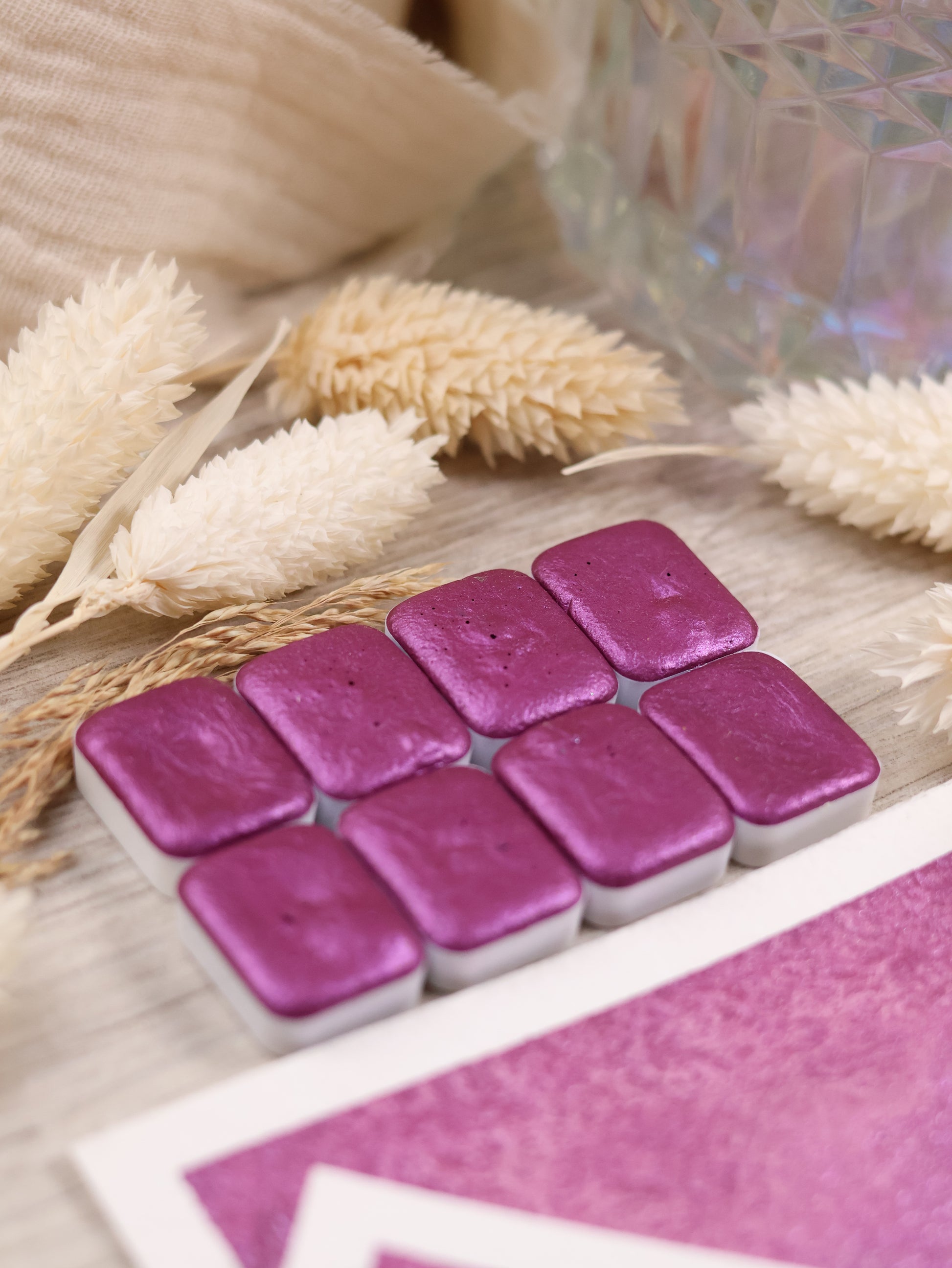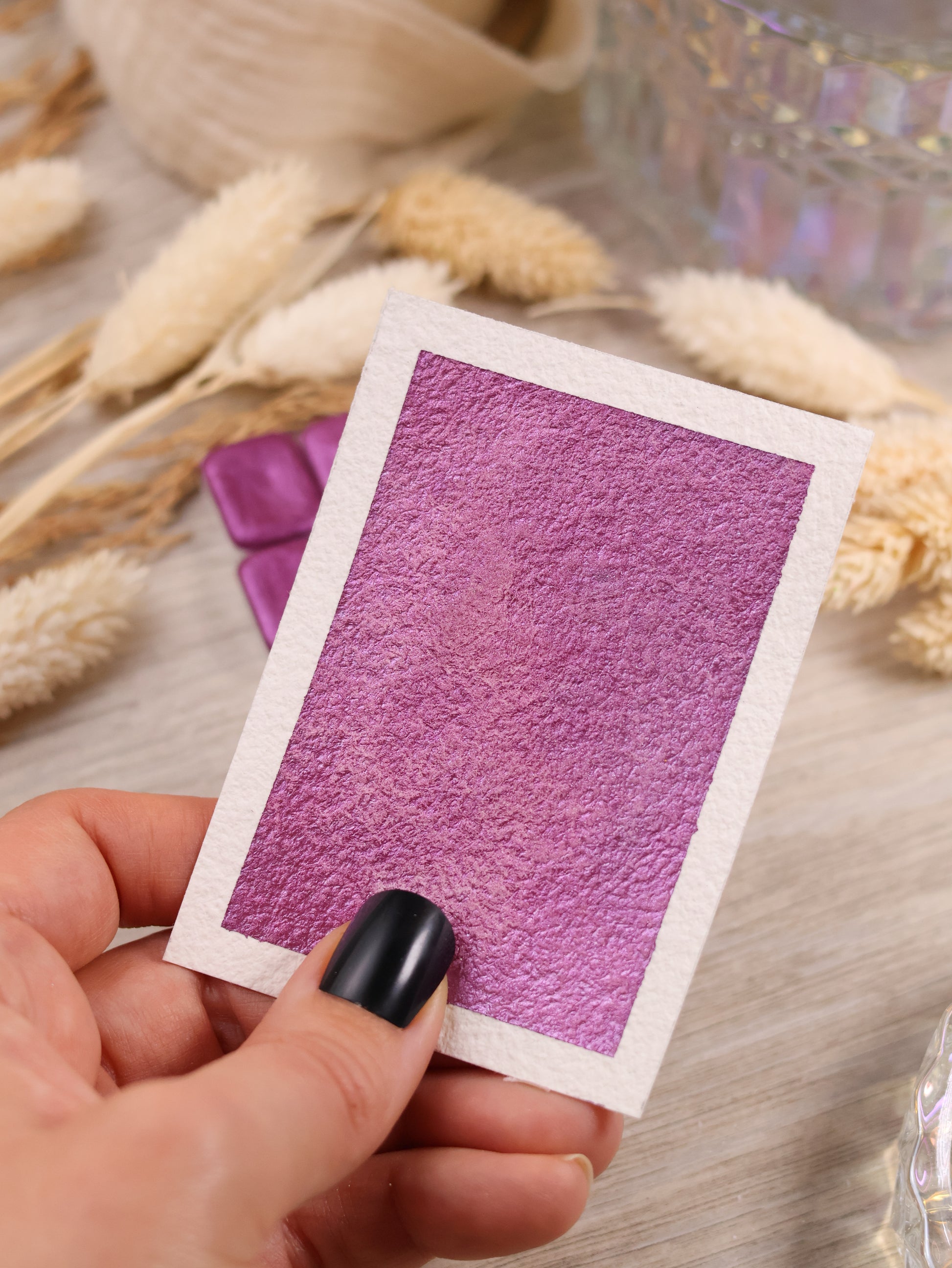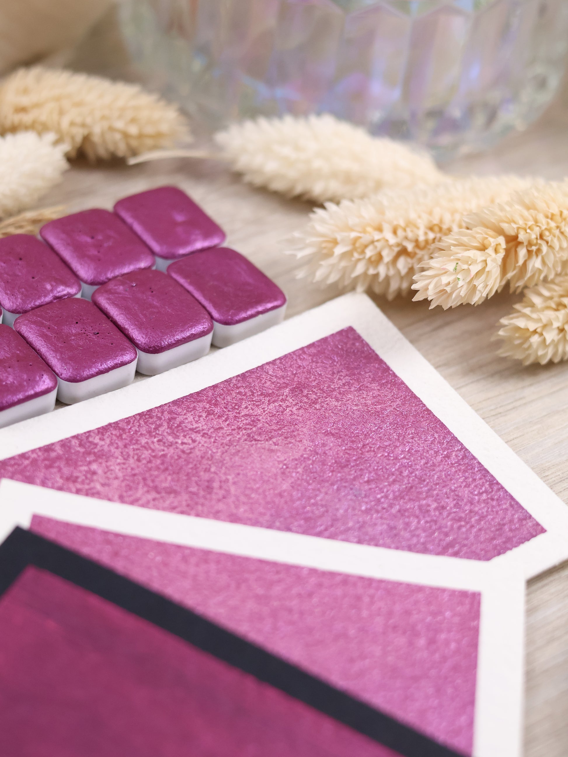 Aquarelles métallisées, scintillantes ou pailletées faites à la main, fabriquées à partir de pigments de mica de qualité cosmétique. * Mettez de l’eau sur les godets et attendez 3 ~ 5 minutes pour un meilleur rendu des couleurs. Taille des godets : Quart de godet : 1 ml - 1.5x1.9x0.5 cm Mini godet : 0.5 ml - 1.5x1.1x0.5 cm. NB*: Pendant la fabrication, il peut y avoir des imperfections mineures telles que des bulles ou des fissures, celles-ci font partie du processus et n’entravent pas la qualité ou l’utilisation du produit. J’ai essayé de représenter les produits aussi précisément que possible, mais les couleurs sur les écrans et les mobiles peuvent varier. Notez également que tous les matériaux d’arts / décoratifs montrés sur les photos sont utilisés uniquement à des fins décoratives et ne sont pas inclus. Utilisation des produits : Nos aquarelles ne sont pas des produits classiques et doivent être utilisées différemment. Elles aiment être utilisées avec délicatesse pour en obtenir le meilleur. Visualiser le tutoriel sur notre Instagram « Utilisation » et prenez le temps de faire quelques essais avant de vous lancer dans vos créations pour vous familiariser avec votre nouvelle aquarelle. Les aquarelles caméléons : Pour un résultat optimal, je recommande de les utiliser sur du papier noir ou une couleur foncée et une surface suffisamment longue pour observer l’effet caméléon. Sur papier blanc le rendu est différent. Les chromes : Ils ne nécessitent qu'une couche sur papier noir mais plutôt deux sur papier blanc pour une intensité maximale. Note de la fée paillettes ✨ :Il arrive que certaines couleurs Velvets se décollent légèrement du godet en séchant — une petite coquetterie naturelle de l’aquarelle artisanale ! Rien de grave : un petit point de colle suffit à la remettre en place. Cela n’altère en rien la magie de vos créations. 🌸